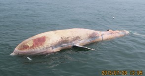 7月28下午12:30,民生005船接到海洋石油102指示,去渤中34-1平臺(tái)卸貨,途中發(fā)現(xiàn)一個(gè)不明物體,船長(zhǎng)劉逸倫立即采取安全措施,偏離物體停車(chē),慢速向該物體靠近一看,原來(lái)是一條重達(dá)2-3噸的白色大鯨。但是它已死亡多時(shí),船長(zhǎng)立即將此情況匯報(bào)平臺(tái)。這時(shí),我看到船員兄弟有的遺憾,有的沮喪,有的閃爍著晶瑩淚珠。巨鯨全身傷痕累累,尾部被漁網(wǎng)纏繞,船長(zhǎng)用相機(jī)拍攝了巨鯨龐大的軀體。